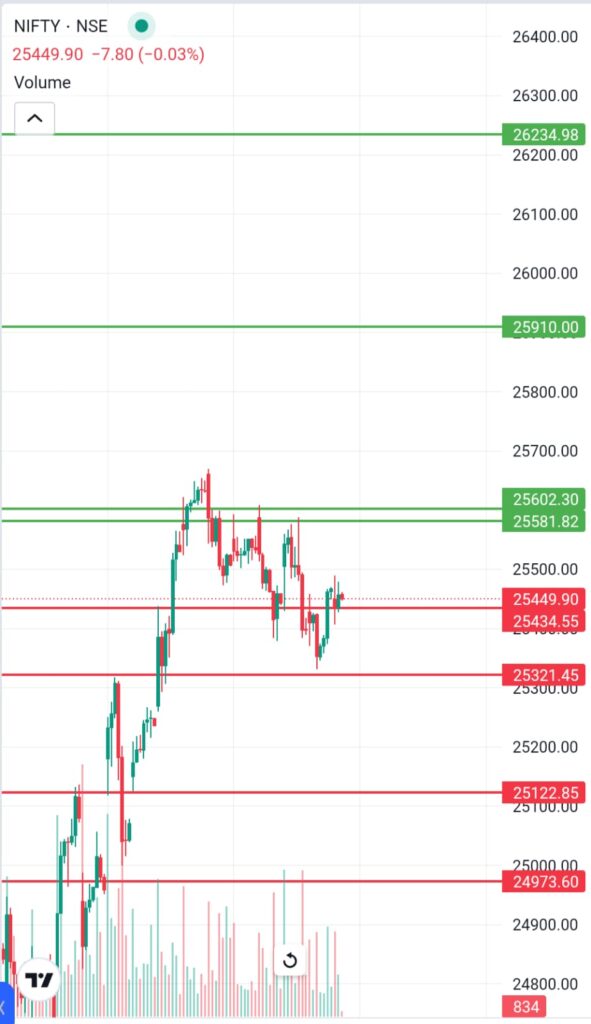इंडे ट्रेडिंग के लिए निफ्टी-फिफ्टी में पहला सपोर्ट 25,434 पर है, इस सपोर्ट को तोड़ने के तुरंत बाद यह 25,320 पर है, तीसरा सपोर्ट 25,120 पर है और आखिरी सपोर्ट 25,974 पर है।